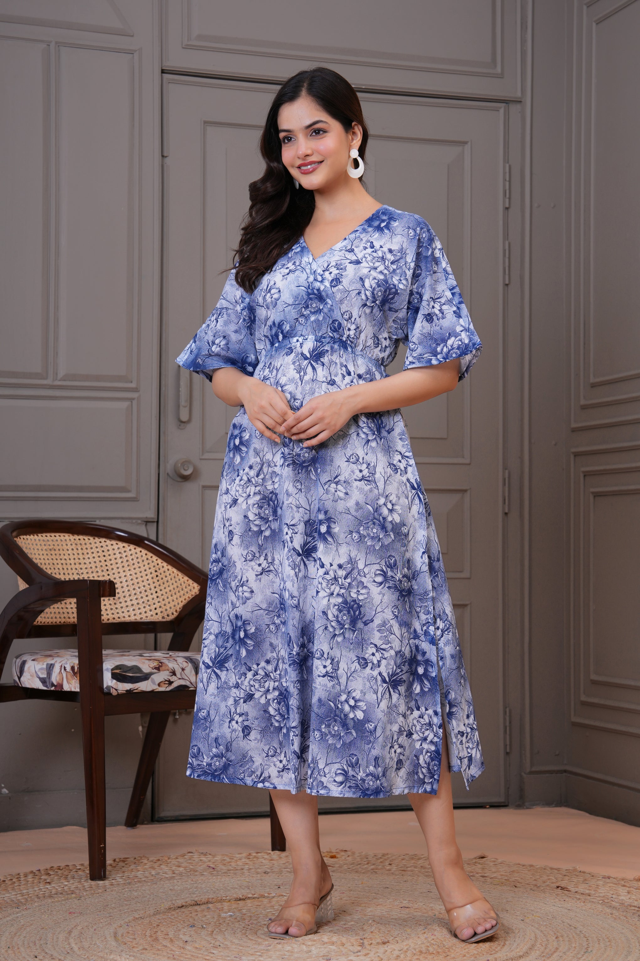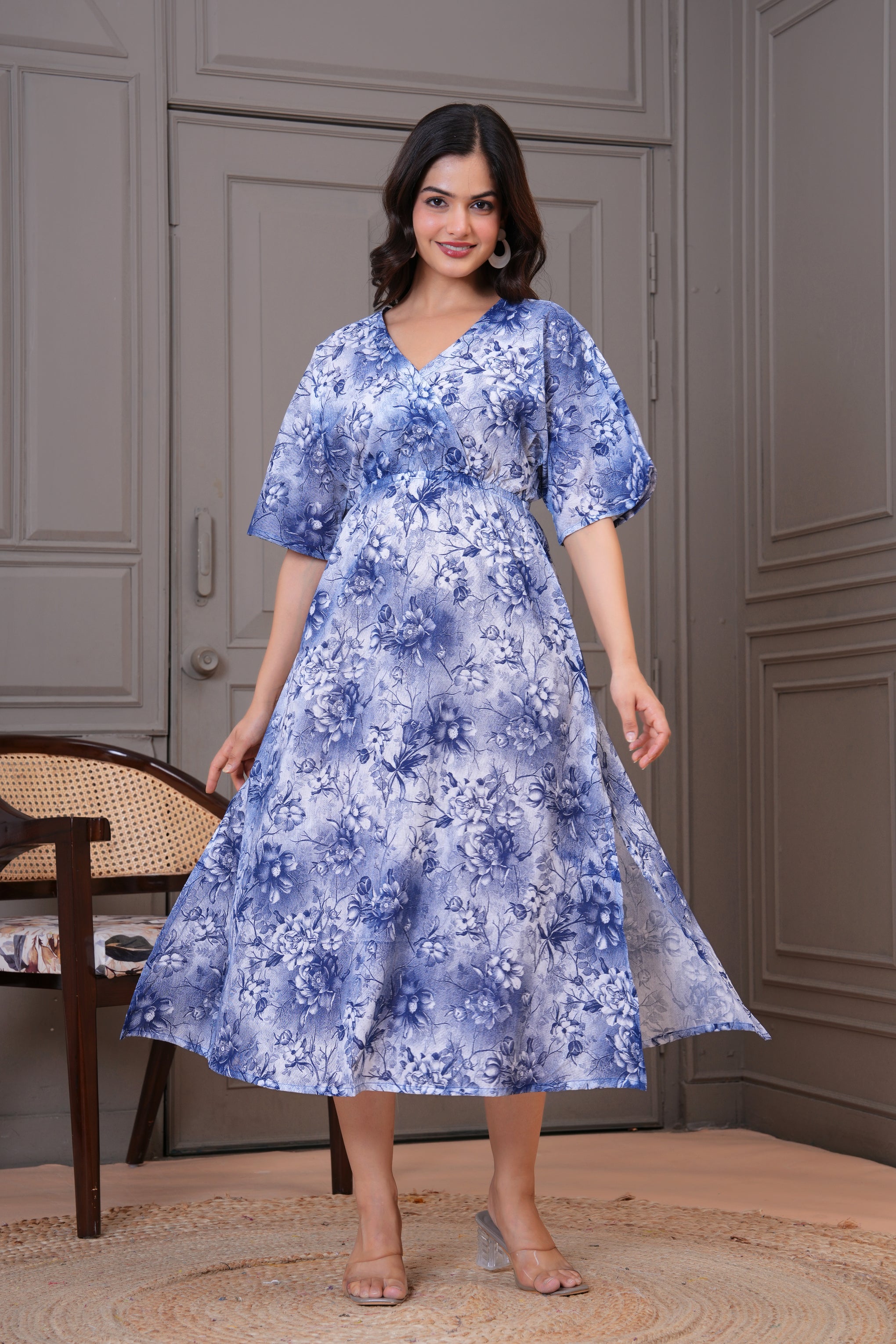 Elegant blue floral dress woman daily wear