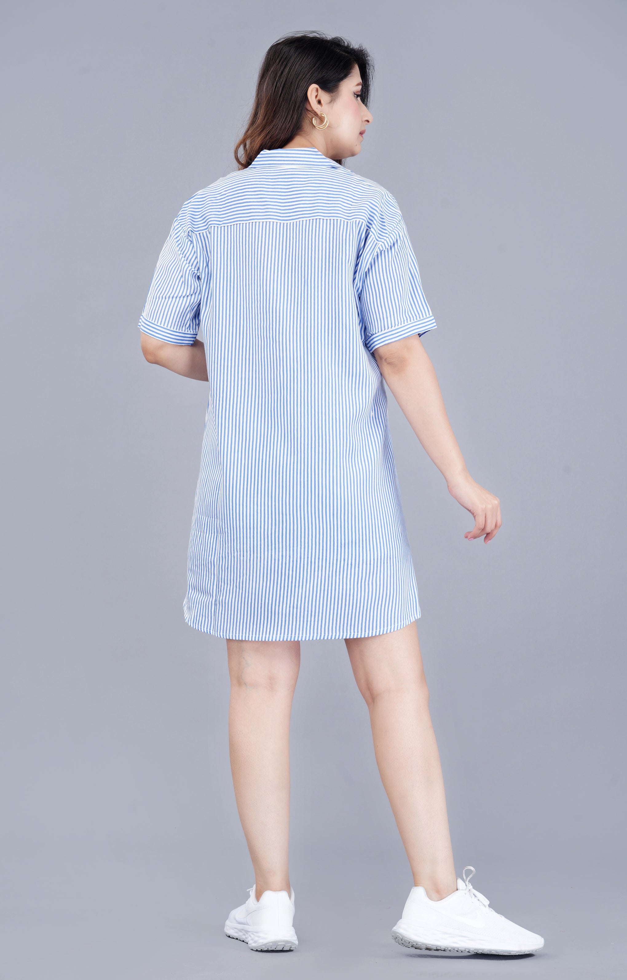 Add a stylish touch to your summer wardrobe with this women’s blue designer printed striped dress. Crafted from soft and breathable viscose rayon fabric, this ready-to-wear dress ensures all-day comfort with a flattering regular fit. The trendy striped print combined with a modern high-low hemline gives it a chic and contemporary look, making it perfect for casual outings and daily wear.