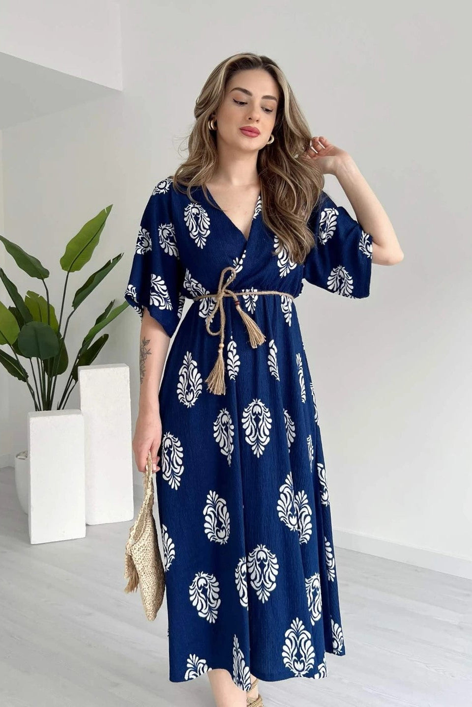 This blue floral wrap midi dress for ladies is crafted from soft and breathable rayon fabric for all-day comfort. Featuring a flattering fit & flare silhouette, V-neckline, adjustable wrap tie-up, 3/4 sleeves and calf-length flow, it offers a stylish yet relaxed look for casual outings, office wear and everyday styling.