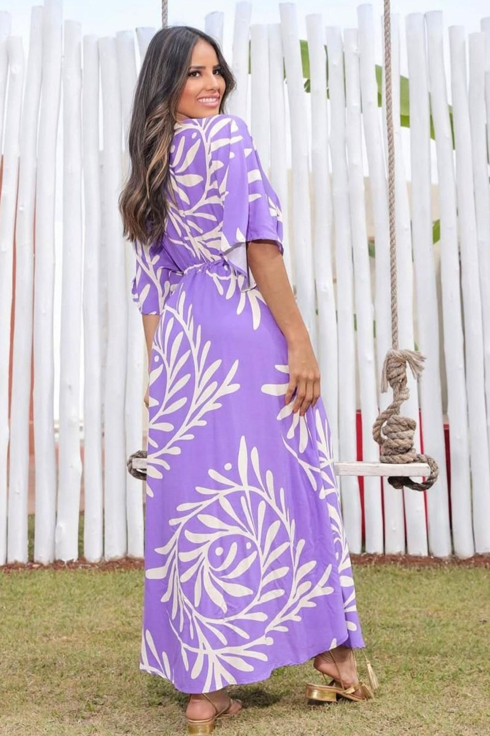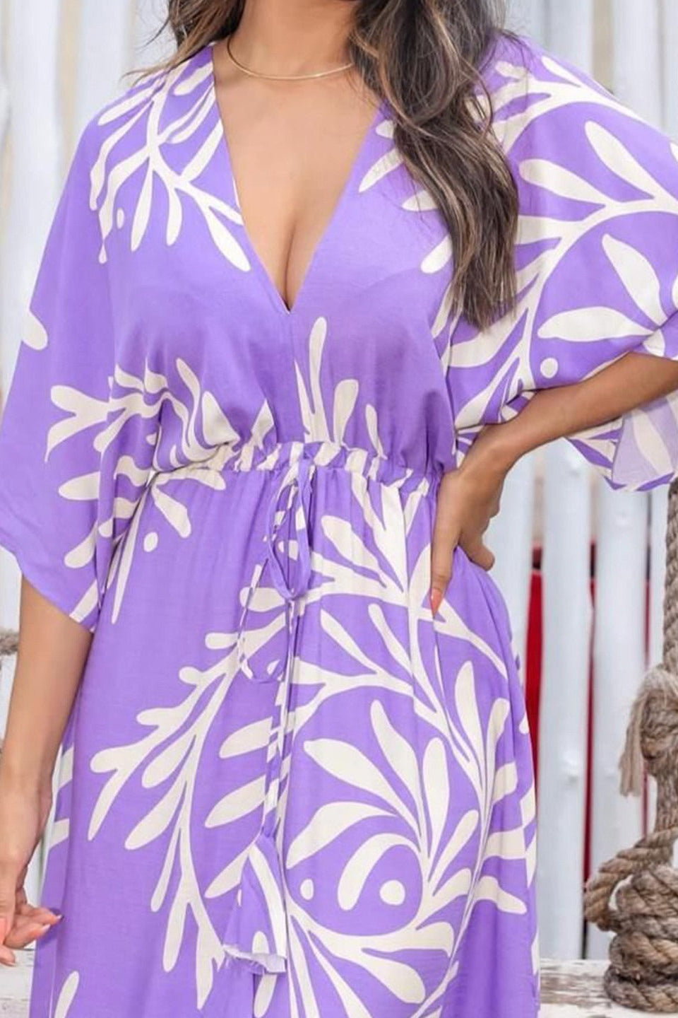 Designed with a stylish abstract print, this purple rayon fit & flare dress for lady offers a soft texture and graceful flow. Featuring a V-neck, 3/4 sleeves and calf-length silhouette, it is perfect for casual outings, travel wear and everyday comfort.
