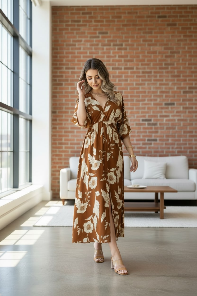 Designed with a warm floral print, this brown rayon fit & flare dress for woman delivers comfort with elegance. Featuring a V-neck, 3/4 sleeves and calf-length silhouette, it drapes beautifully and suits casual outings, office wear and everyday styling.