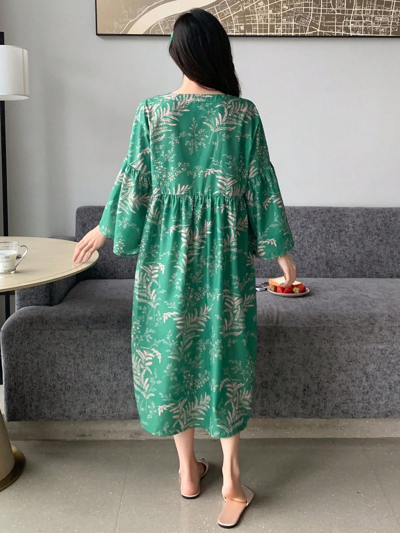 Women Green Printed Loose Fit & Flare Midi Dress